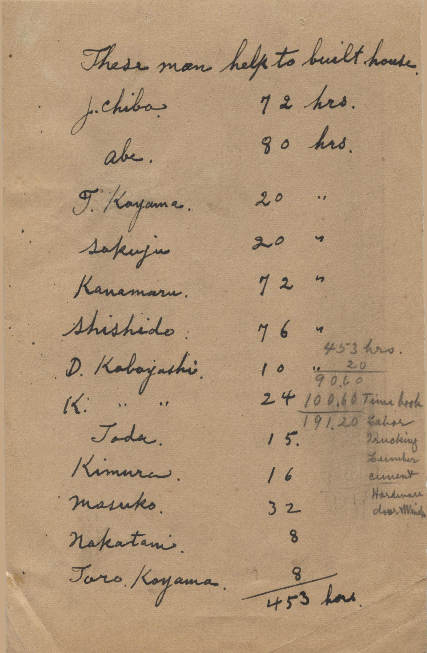These men help to built [sic] houseWe are hoping you can shed some light on a mystery. We received some donated papers from the Rainbow Ranche. Tucked inside a hard cover Rainbow Ranche diary for 1924 to April 1938 was the piece of paper that I am sending as an attachment. As you can see, it is undated and does not say which house is being built. There is no mention in the diary of any building work being done, but Addie Maehara and Anne Land thought, based on the names in the list, that it might be the house of your parents. Mr. and Mrs. Sam Hikichi. Addie recognized some, though not all, of the names and thought that it might be the late twenties or early thirties.