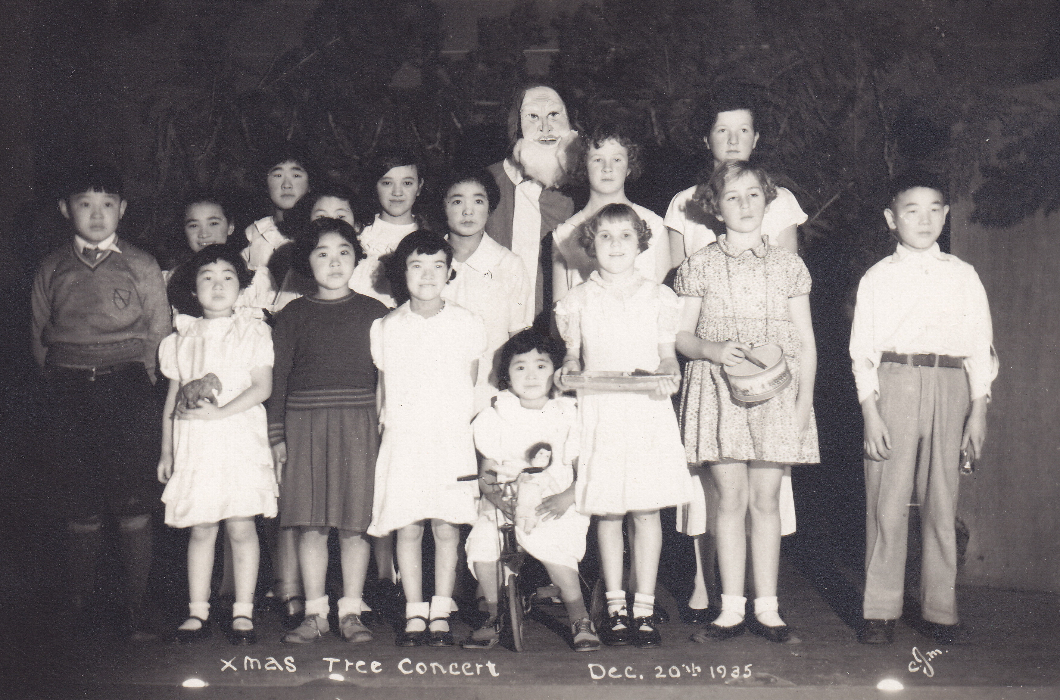 [Teacher] Mrs. Parker was reputed to present a concert unequalled anywhere. We sang ‘Santa Claus is coming to town’ with Mrs. Parker at the piano. Every child received a gift, an orange, and a net bag full of sugary candy. We had the time of our lives. Akira [Hikichi] and I always did recitations. We presented ‘The Night before Christmas’ and a piece about two Chinese boys. After Akira left for Vernon, in spite of Mrs. Parker’s objections, I insisted on doing a recitiation portraying a French Canadian voyageur. I believe a poet called William Henry Drummond composed it. I got my way. There I was, a little Japanese boy with close-cropped hair, reciting away with a Québécois accent. Poor Mrs. Parker. What she had to put up with.