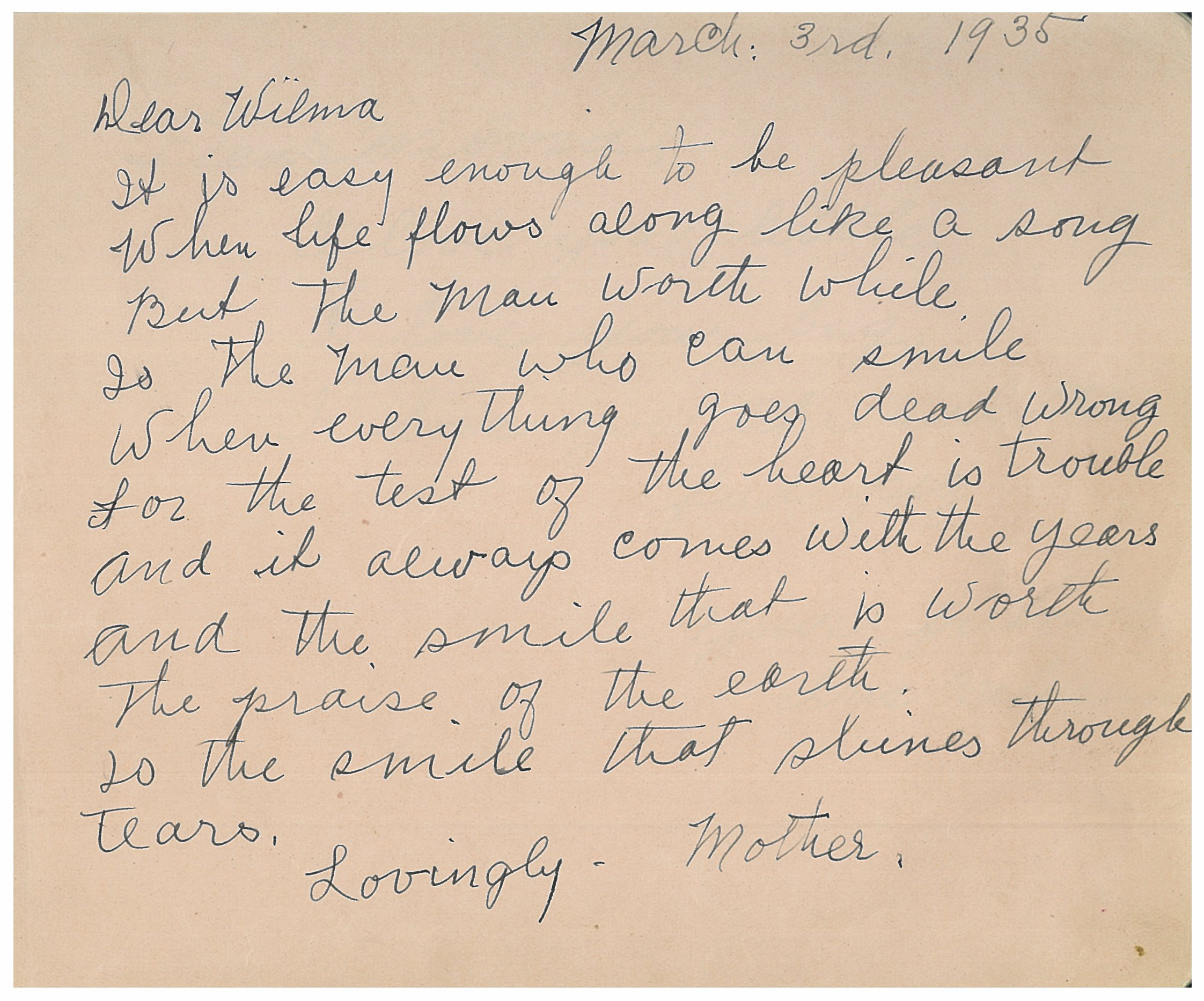My mother’s friend, Mary Shaw MacLaren, wrote the following lines on October 28, 1938: “Dear Wilma, Cautious words, smiles of good will, these kindly actions are the flowers by the wayside which cheer the hearts of fellow travellers in the road of life.”