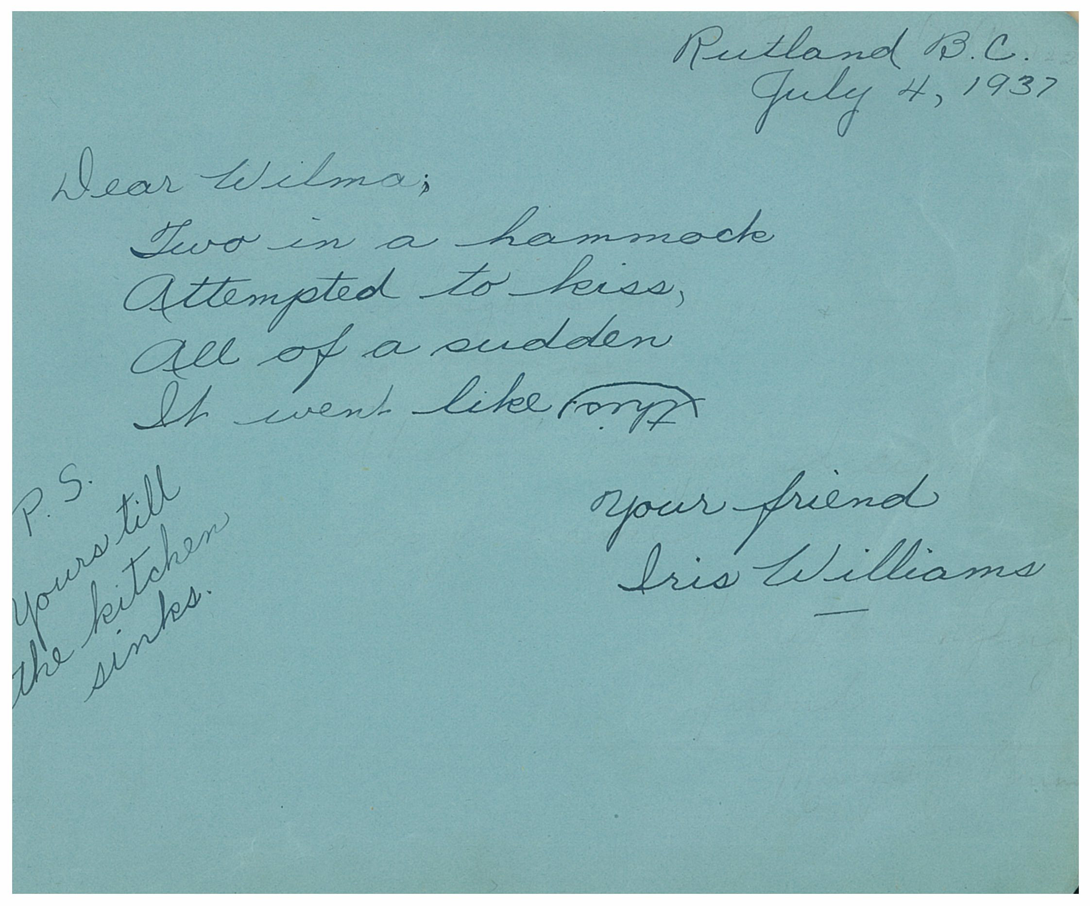 On February 2, 1935, Joy Cross wrote the following poem to her cousin (my mother), Wilma Clement: