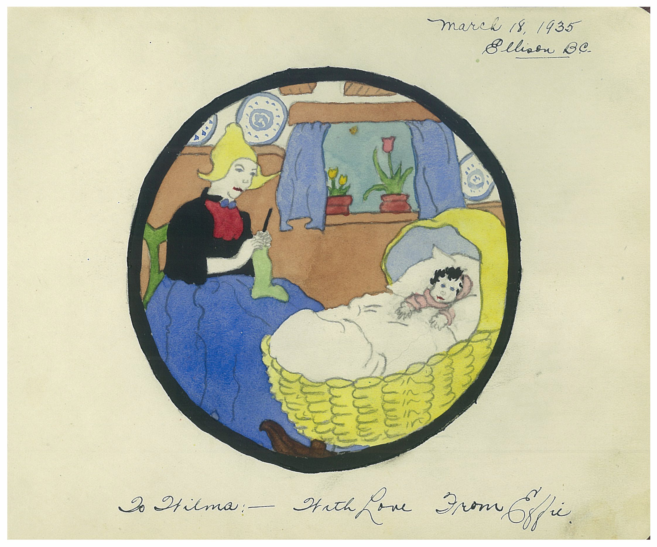 Sometimes, the message was short and simple. On March 18, 1935, my mother’s sister-in-law, Effie (née Mitchell) Clement wrote: “To Wilma: – With Love From Effie.” However, this short message was accompanied by a hand drawn and coloured picture, showing a woman and her infant child, attesting to Effie’s artistic prowess.
