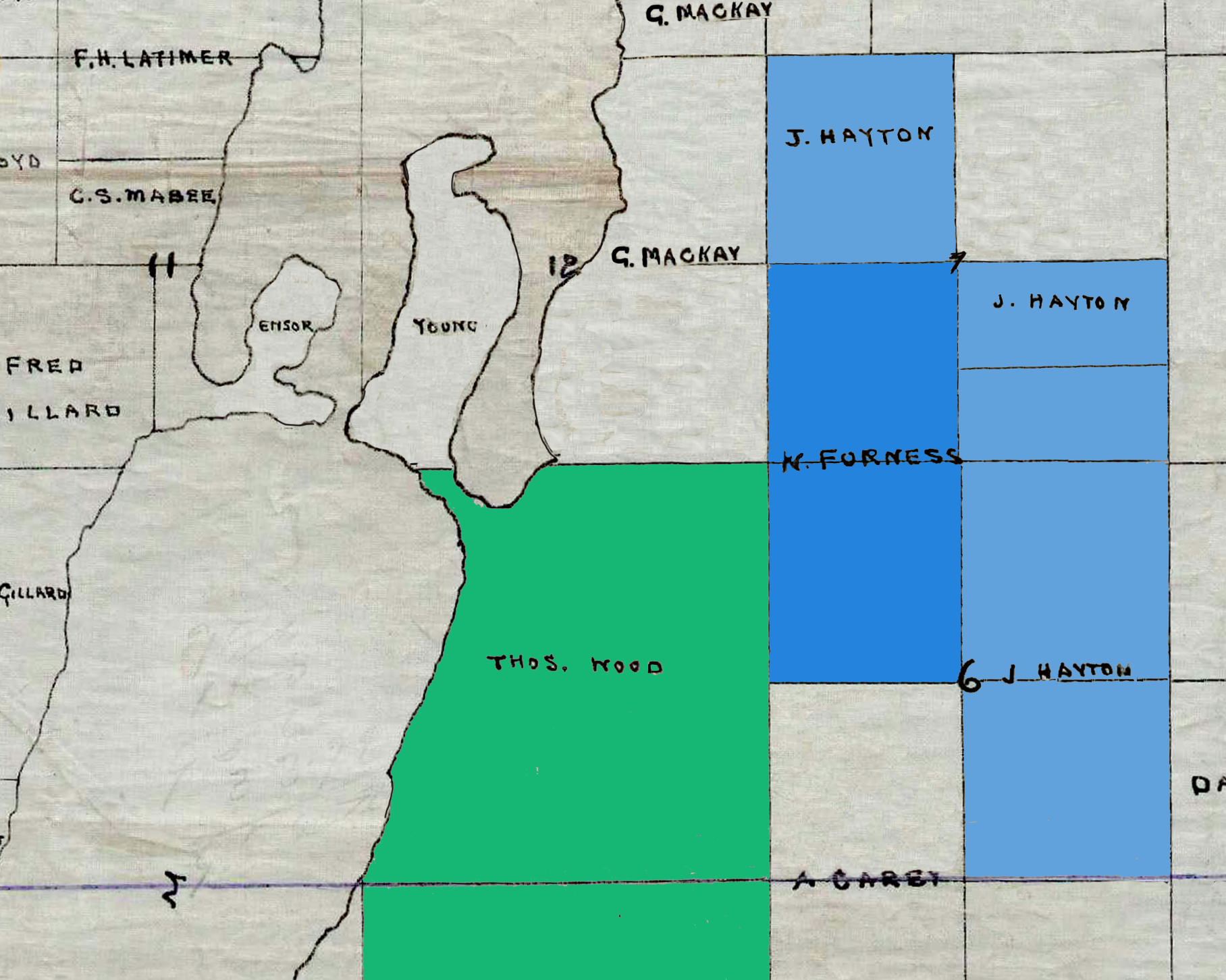 Joseph Hayton was the third owner of the V Bar V ranch in Oyama. Hayton Creek and Hayton Road are named after him. He was born near Ventnor, Isle of Wight to George Hayton, Rector of Niton, and his wife Ellen Louisa (Chadwick) Hayton. He immigrated to Canada from England at age 19 on 25 April 1895 aboard the Laurentian. He must have returned to England because he enlisted there and served from 1900 to 1901 with the British South African Police and Loch’s Horse during the Boer War. He likely arrived back in Canada in 1902 to purchase the V Bar V Ranch from William Furniss. In 1905 and 1906 Hayton successfully completed his Crown Grant applications on adjacent lots, greatly enlarging the acreage of the V Bar V. He traveled to England in 1908, returned, and settled down on the V Bar V. In the 1911 Canada Census he was listed as a single male with no hired hands.