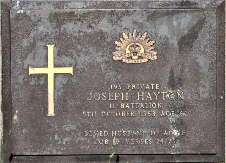 Hayton’s domestic life is traceable through electoral rolls for Western Australia. Beginning in 1917 he is seen living with Adeline Lois (nee Hawkins) Hayton in Western Australia.[1] In 1917 he and Adeline lived in Bonny Downs where he was employed as a “station hand.” In 1925 he is listed as a farmer on Goomarin Farm in Burracoppin, in 1936 they lived in Darlington, and in 1954 in Fremantle. The retired couple traveled to England in 1950. Joseph died on 5 October 1958 at age 82 and Adeline died in 1961.