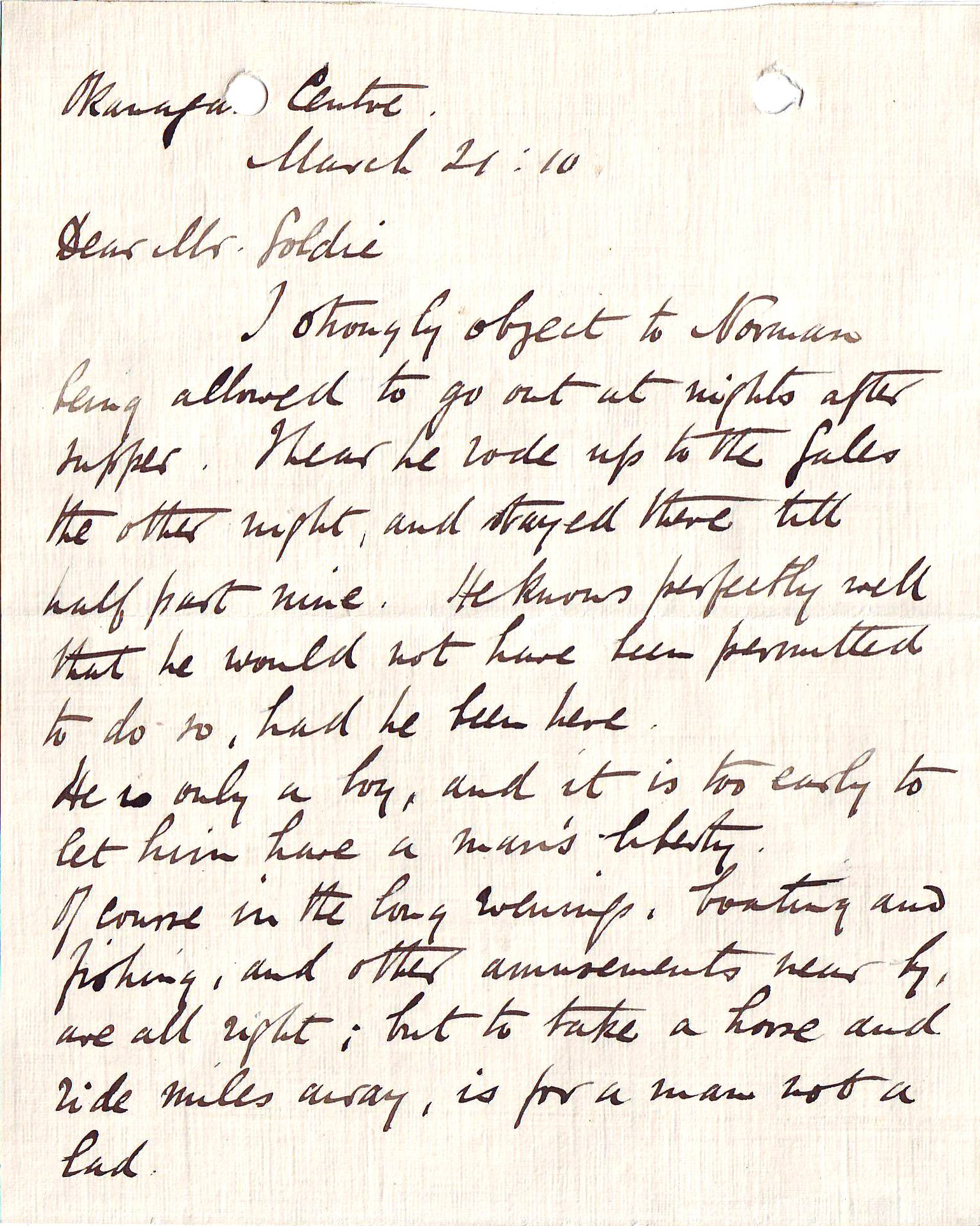 I strongly object to Norman being allowed to go out at nights after supper. I hear he rode up to the Gales [?] the other night, and stayed there until half past nine. He knows perfectly well that he would not have been permitted to do so, had he been here.