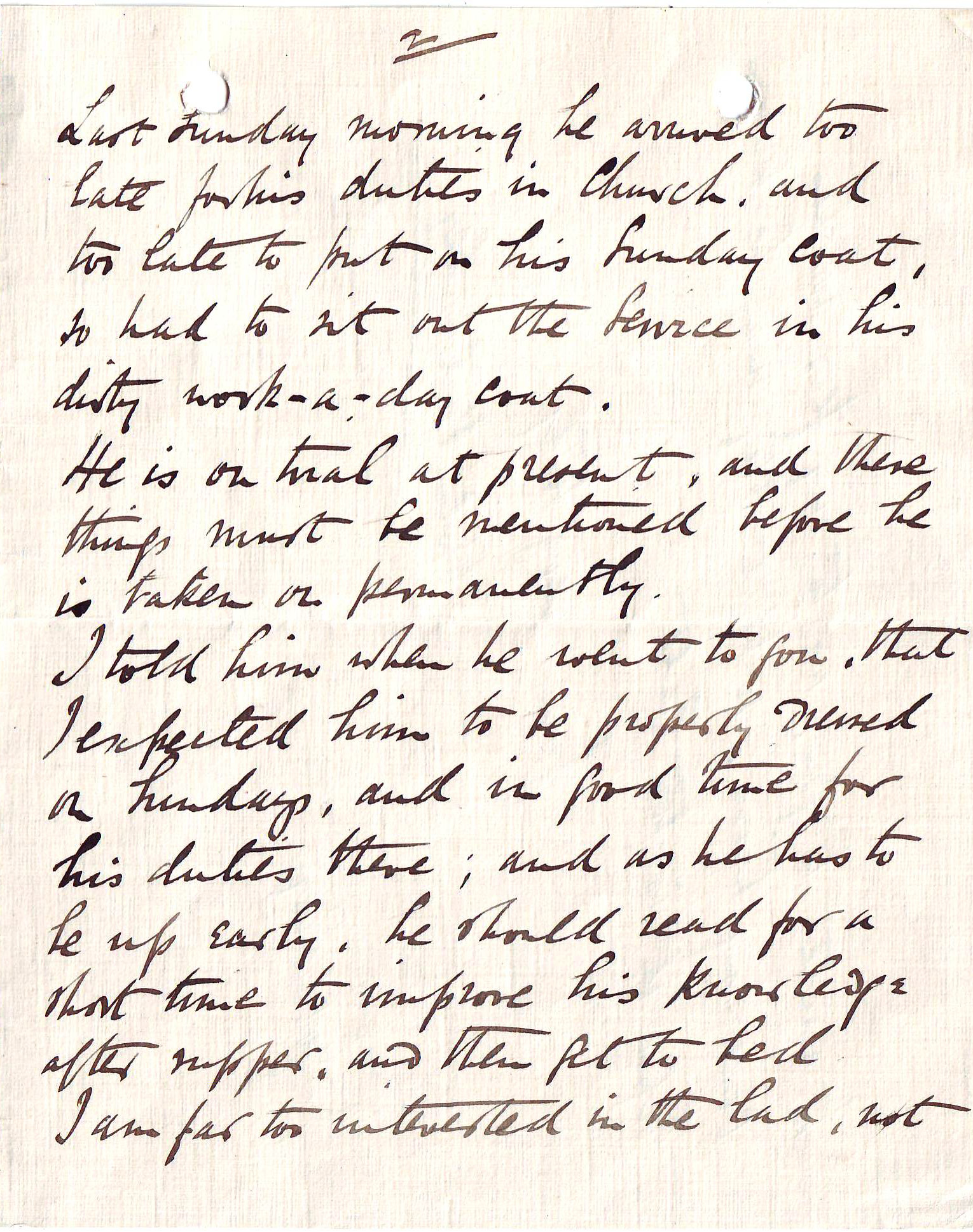 He is on trial at present, and these things must be mentioned before he is taken on permanently. I told him when he went to you that I expected him to be properly dressed on Sundays, and in good time for his duties there; and as he has to be up early, he should read for a short time to improve his knowledge after supper and then get to bed.
