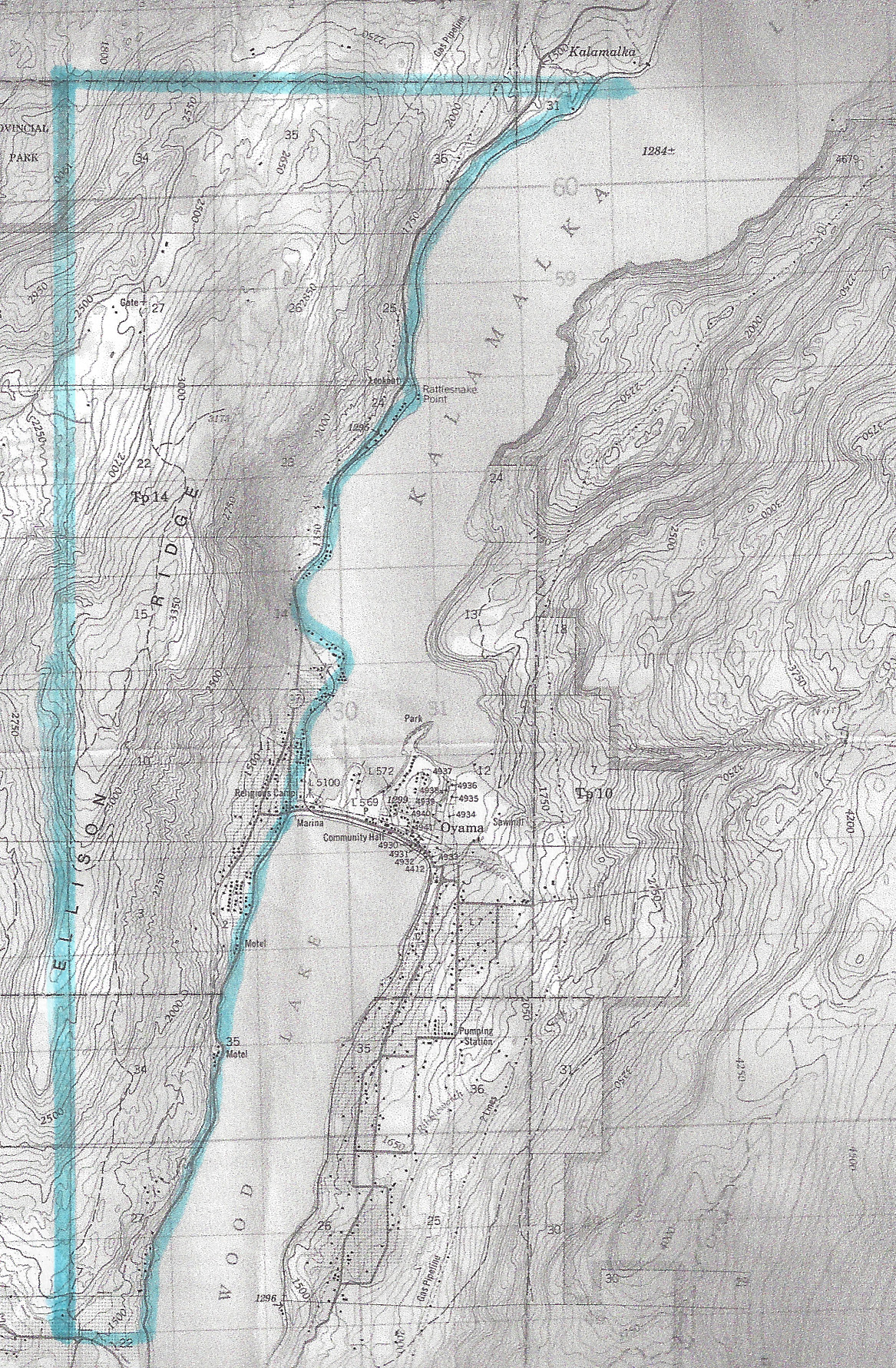 The accompanying map shows the boundaries of this polling division, which began at the junction of Okanagan Centre Road West and Oceola Road. From there the boundary went due east to Wood Lake, then the boundary followed the shoreline of Wood and Kalamalka lakes as far north as Kekuli Bay campsite, then west to the Ellison Provincial Park boundary and then south in a straight line to the starting point. This polling station includes some residents of Okanagan Centre as well as those on the west side of Oyama.