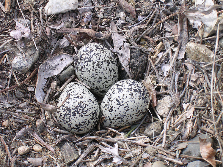 Killdeer nest on the ground in fields, meadows, or ballparks, on mud flats or pebbly ground. The eggs are laid right in the open often with little soft vegetation but usually with camouflaging stones or gravel around them. Killdeer often pretend to have a broken wing to lure a potential predator away from the vulnerable eggs. The chicks can forage for themselves as soon as they are hatched. Killdeer eat mainly insects and very few weed seeds. They are abundant across Canada from coast to coast and winter in the lower US states.