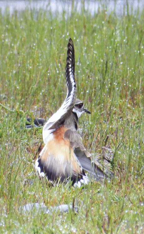 KilldeerKilldeer are the first shorebird to return in spring. This year the first Killdeer were seen in Kelowna in mid-February and as I write in early March many more have arrived. Killdeer are 10.5”/~27cm in size, have two broad black bands across their upper chest, a brownish back, a rusty orange rump and tail, long pointed wings and a large dark eye rimmed in red, which looks big for the size of the bird’s head. They are members of the plover family, so they move like all plovers with a few short steps, then a pause, a few short steps, then a pause. Their name comes from the high-pitched calls often heard when they fly.