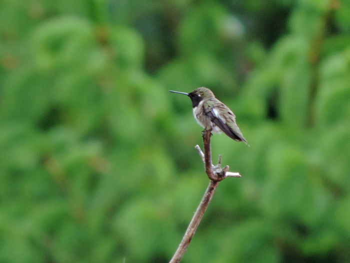 Much rarer than either of these two is the Black-chinned Hummingbird, though I usually see one or two each summer. While its throat feathers look black too, hence its name, they are a brilliant rich purple when lit, bordered below with a broad white band, very dramatic. These are slender birds, and their beaks are slightly down-curved.