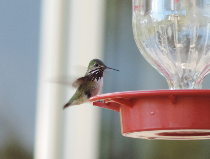 Four species of hummingbird can be seen here though not Ruby-throated Hummingbirds, only found east of the Rockies. Anna’s Hummingbirds, which are year round at the coast, occasionally turn up here in winter. But it is the trio of Calliope, Rufous and Black-chinned Hummingbirds that enchant us in the summer when they come here to breed.