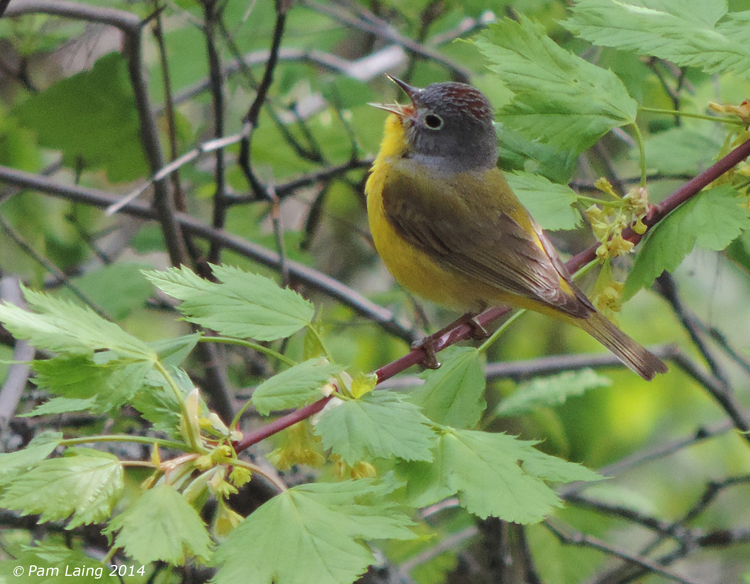 Similar but prettier is the Nashville Warbler, which has bright yellow underparts, and a pale grey hood. Look carefully; it also has a complete white eye ring. Occasionally you might catch a glimpse of its dull orange head patch. Nashville Warblers have a distinctive song, usually ending in a short trill. MacGillivray’s Warblers are similar to Nashville, but much darker. The eye ring is broken, just two white arcs above and below the eye, and the hood is dark grey.