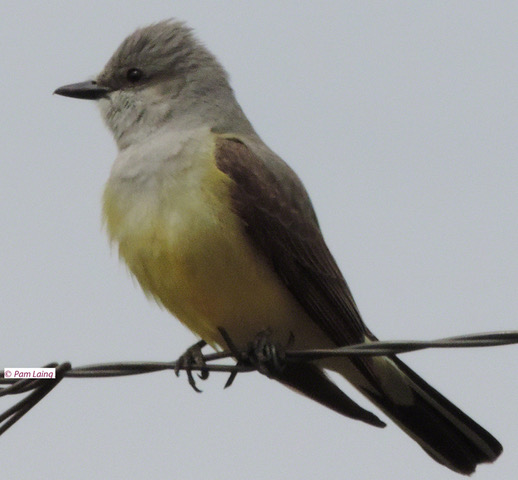 Western Kingbirds raise one brood of chicks annually in an open bulky cup of grass, rootlets and twigs in a tree or shrub, and quite frequently behind transformers on power poles. As well as darting out to take insects on the wing, they also eat berries. Their chattering calls and high-pitched notes are regularly repeated. They attack crows and other predators aggressively if they are near the nest. Their season here is short; migration usually begins in late summer and the birds will winter in the western US and Mexico.